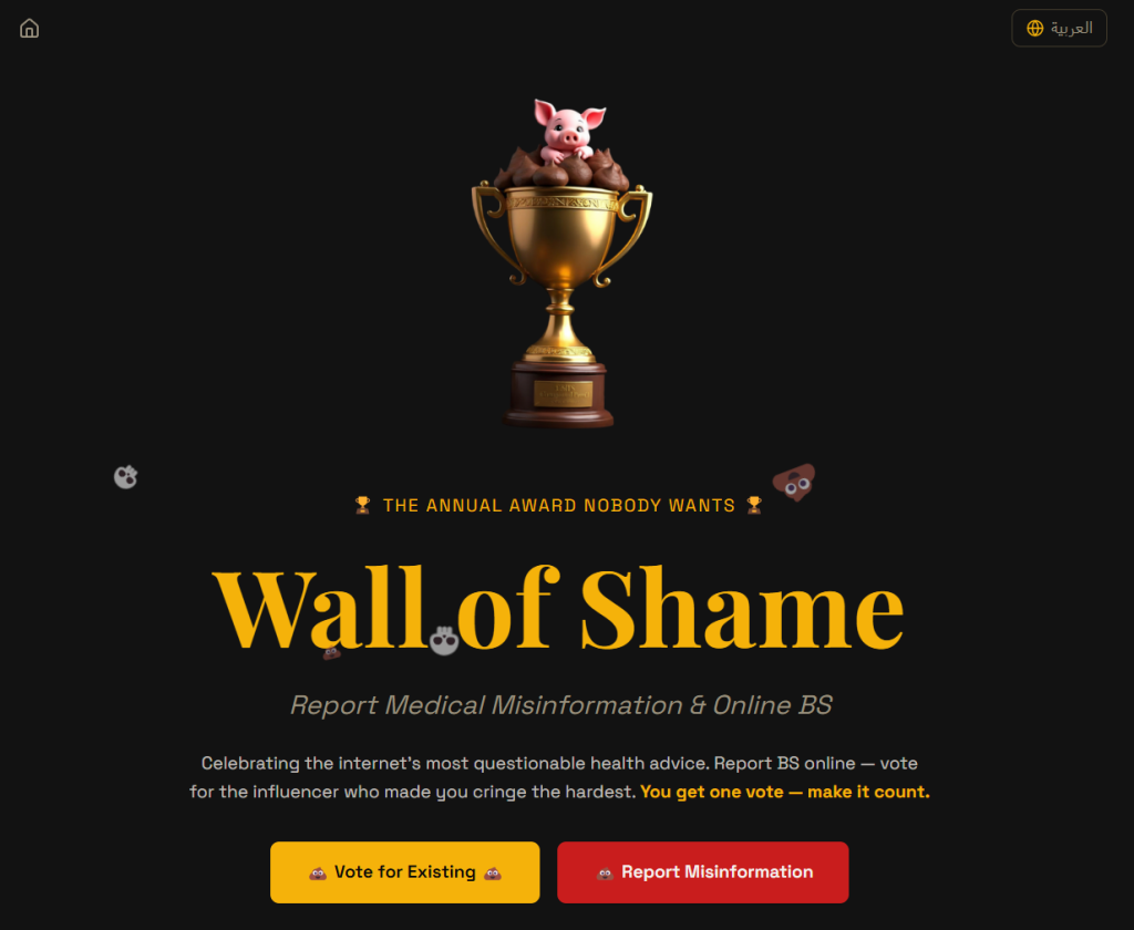 ReportBS.Online هي منصة مجتمعية ساخرة تتيح لأي شخص الإبلاغ عن المؤثرين الذين ينشرون التضليل الطبي على الإنترنت، والتصويت لترتيبهم على “لوحة تصنيف التضليل الطبي” — وهي قائمة عار رقمية يحدد ترتيبها الجمهور بأصواته، لا الخوارزميات ولا المعلنين.